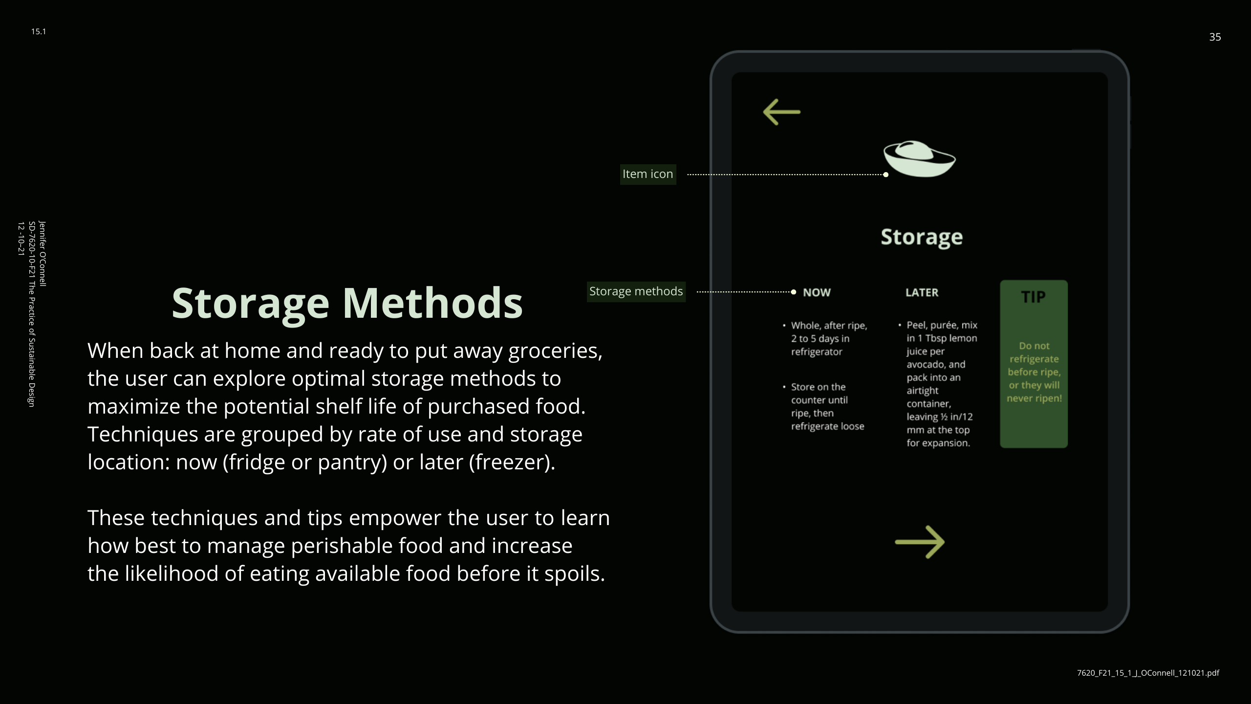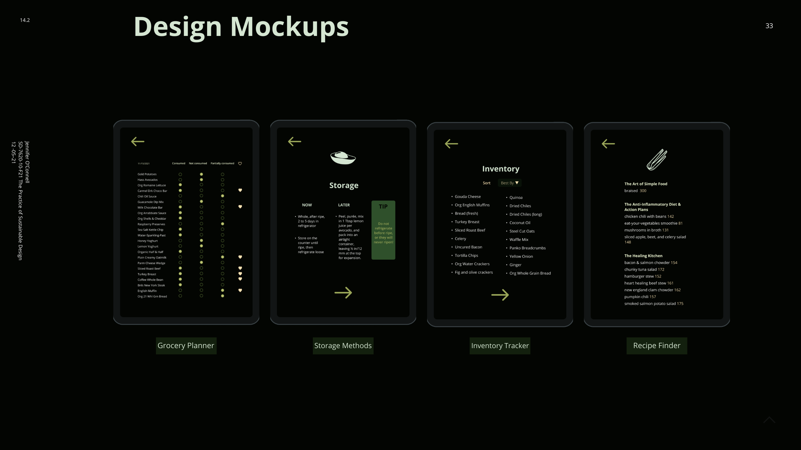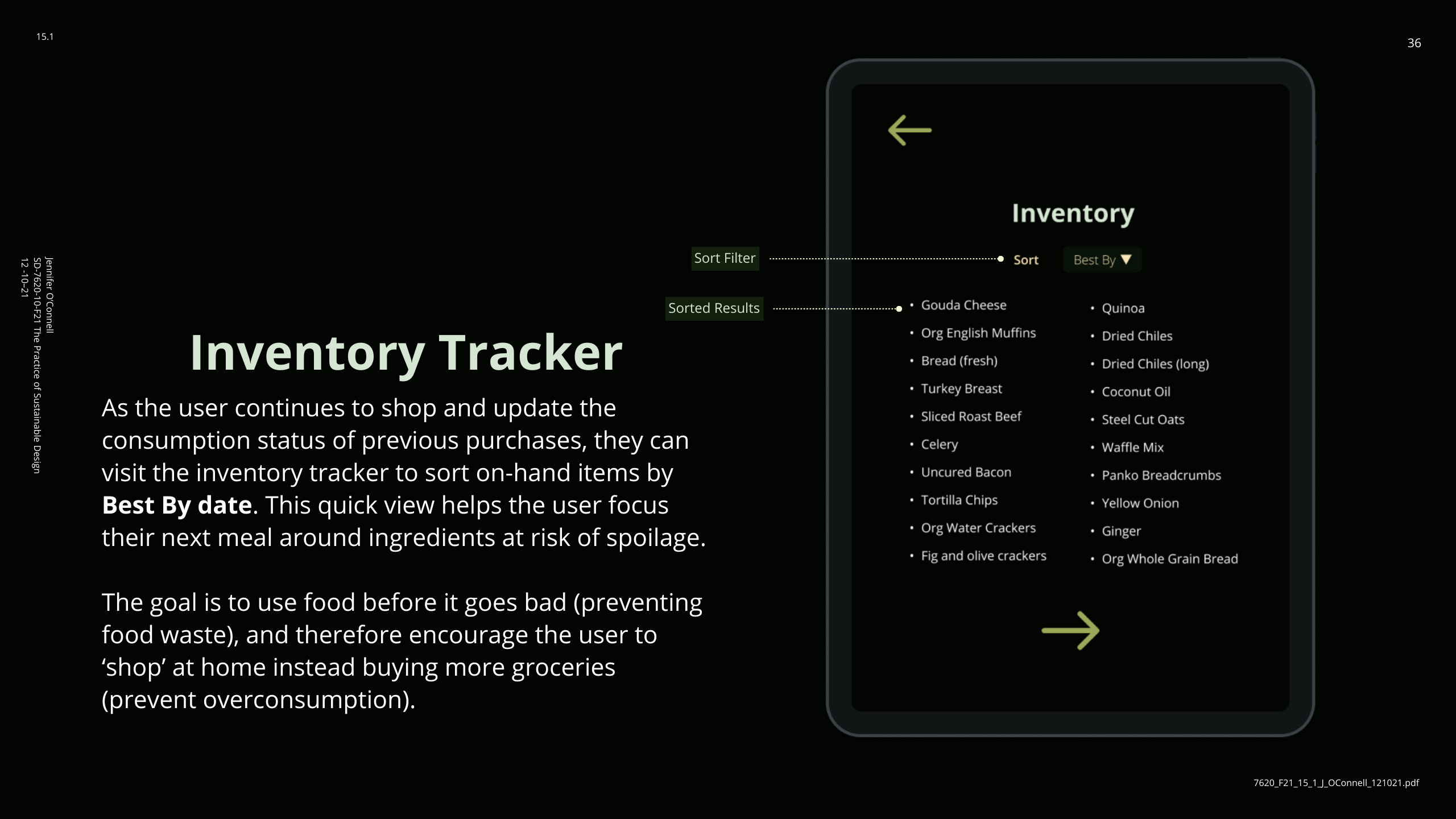 To envision a more resilient future, I designed an app promoting the sustainable behavior of low consumption to reduce the amount of food waste created at home. Households are the largest contributors to food waste in the US. What if there was a product that helped individuals priotize consuming the food they have on hand, before it spoiled?