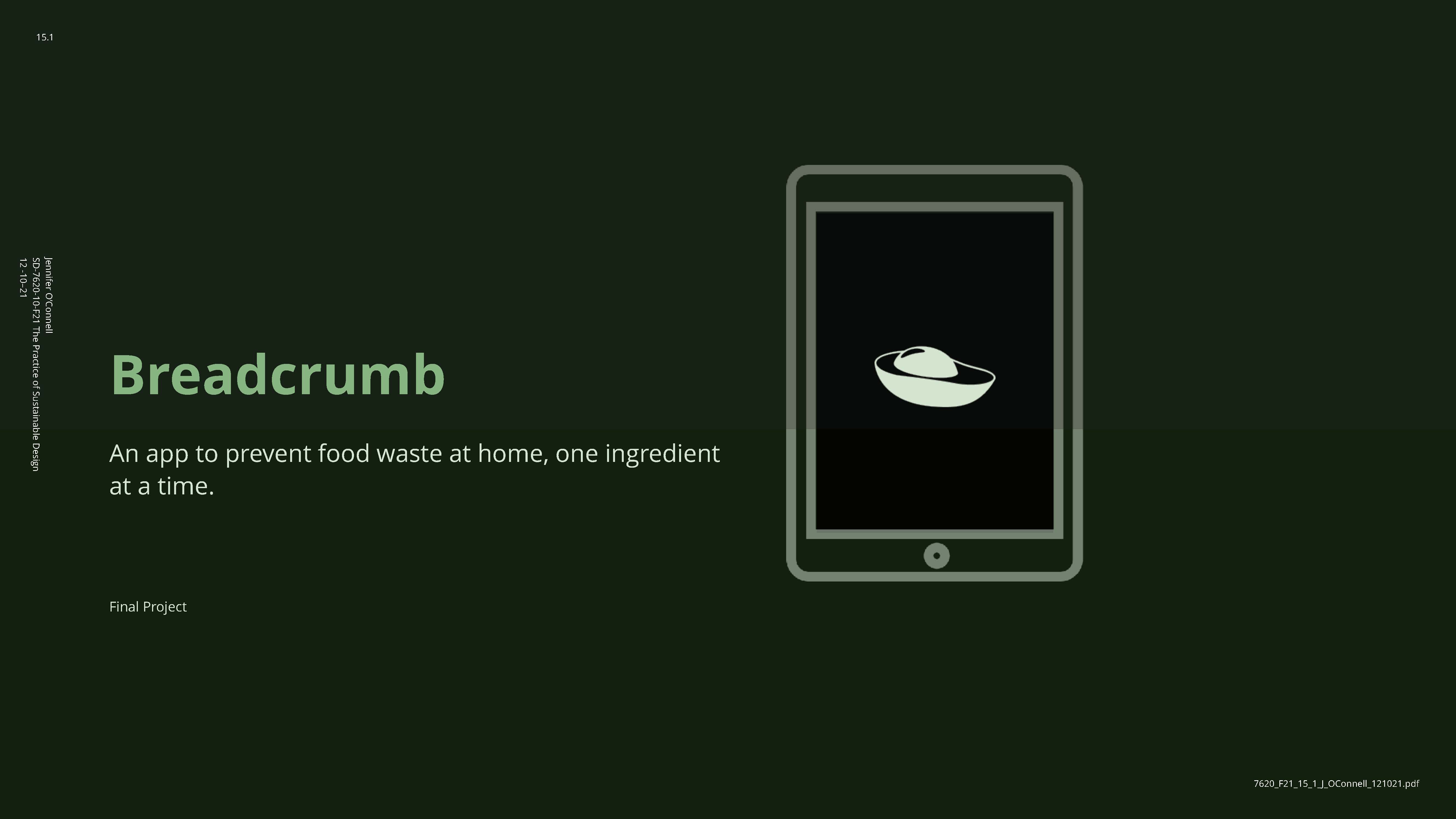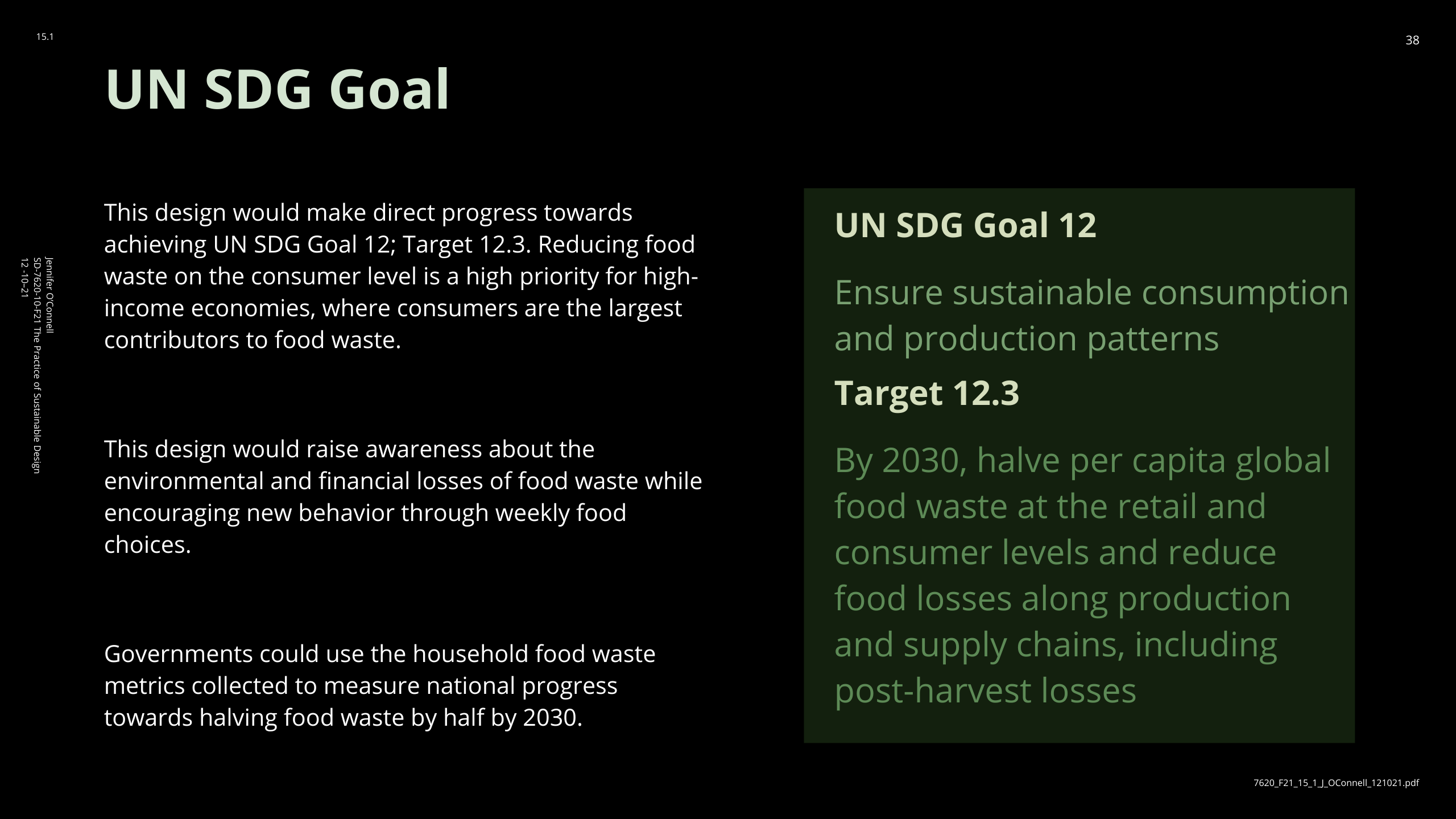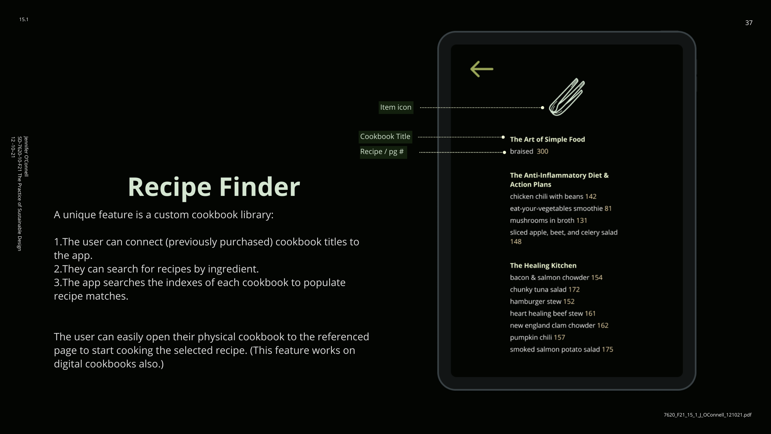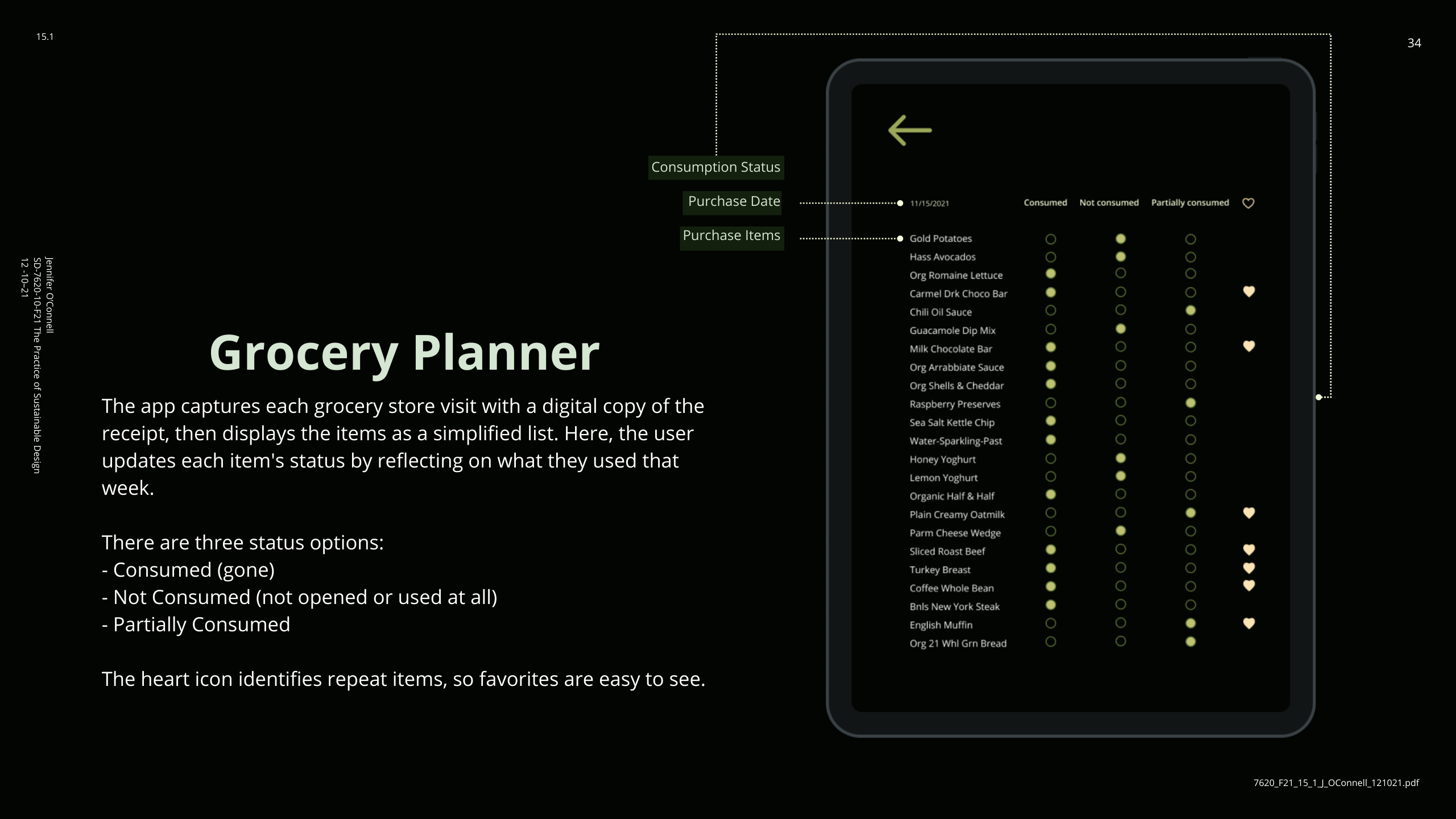 To envision a more resilient future, I designed an app promoting the sustainable behavior of low consumption to reduce the amount of food waste created at home. Households are the largest contributors to food waste in the US. What if there was a product that helped individuals priotize consuming the food they have on hand, before it spoiled?